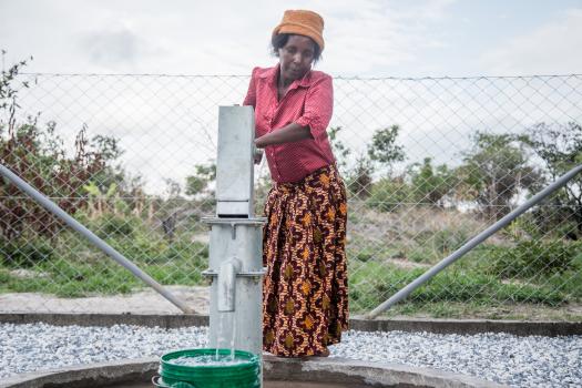 Accessing safe water, a community member drawing water from a borehole. Photo credit: SUN-TA Zambia