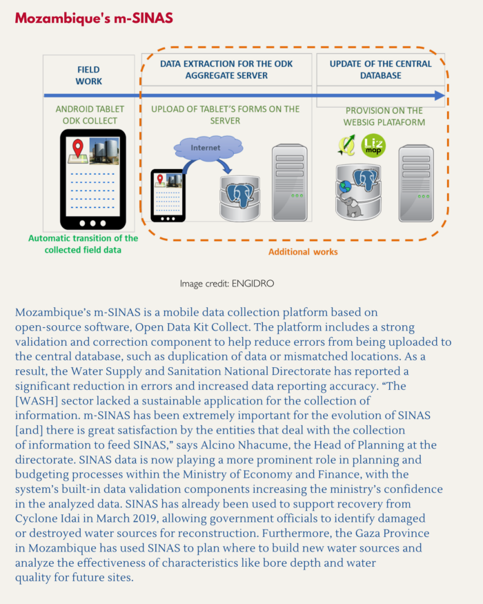 - In Mozambique, WALIS trained 84 provincial and district technicians on the newly developed data collection and management methodologies for SINAS using the new m-SINAS tool. Using tablets with preloaded questionnaires, the trained technicians surveyed the number of water sources, water systems, and communities across four provinces — Maputo, Sofala, Manica, and Cabo Delgado. The technicians using this mobile technology had far fewer data errors and greater reporting accuracy in their surveys. With the aim of scaling up nationally, WALIS supported the government’s expansion of the use of m-SINAS to six additional provinces on a new Open Data Kit platform that is more compatible, flexible, and financially sustainable than previous SINAS technologies. As of December 2019, technicians had conducted more than 6,500 surveys across all provinces using m-SINAS, and they registered about one-third of the country’s water sources.