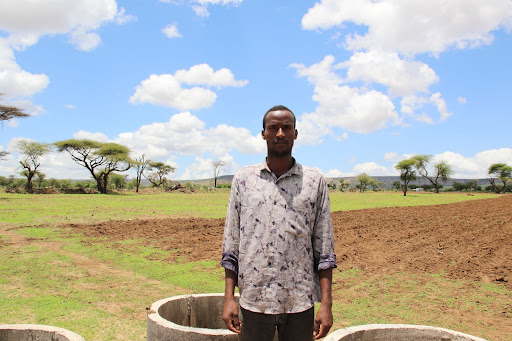 Khaleel Ahmed stands next to some concrete rings used in latrines in the Somali region of Ethiopia. Khaleel sells and installs these rings, among other affordable toilet upgrades, using sales techniques he learned from a USAID-supported training.