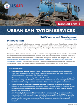The purpose of this technical brief is to provide an overview of the important factors to consider in USAID urban sanitation programming. This document focuses on human excreta management activities that are attributable to the Agency’s Water Directive and does not include broader sanitation areas such as solid waste.