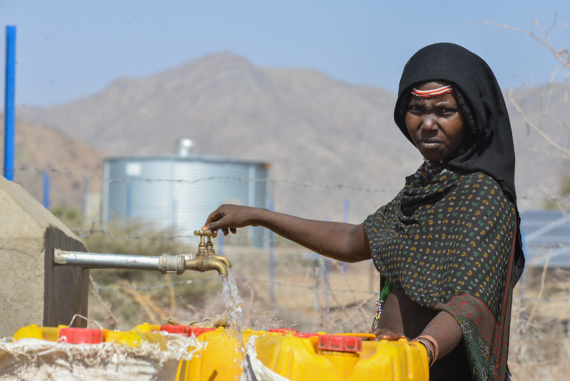 “No more walking for water,” noted Halima, from Ethiopia’s Afar region, who after 15 years now has water at her fingertips supplied via a solar-powered water system facilitated by USAID. Transition from diesel-powered water systems to renewable energy can reduce communities’ reliance on expensive transportation of fuel. Photo credit: Michael Tewelde, USAID Lowland WASH Activity