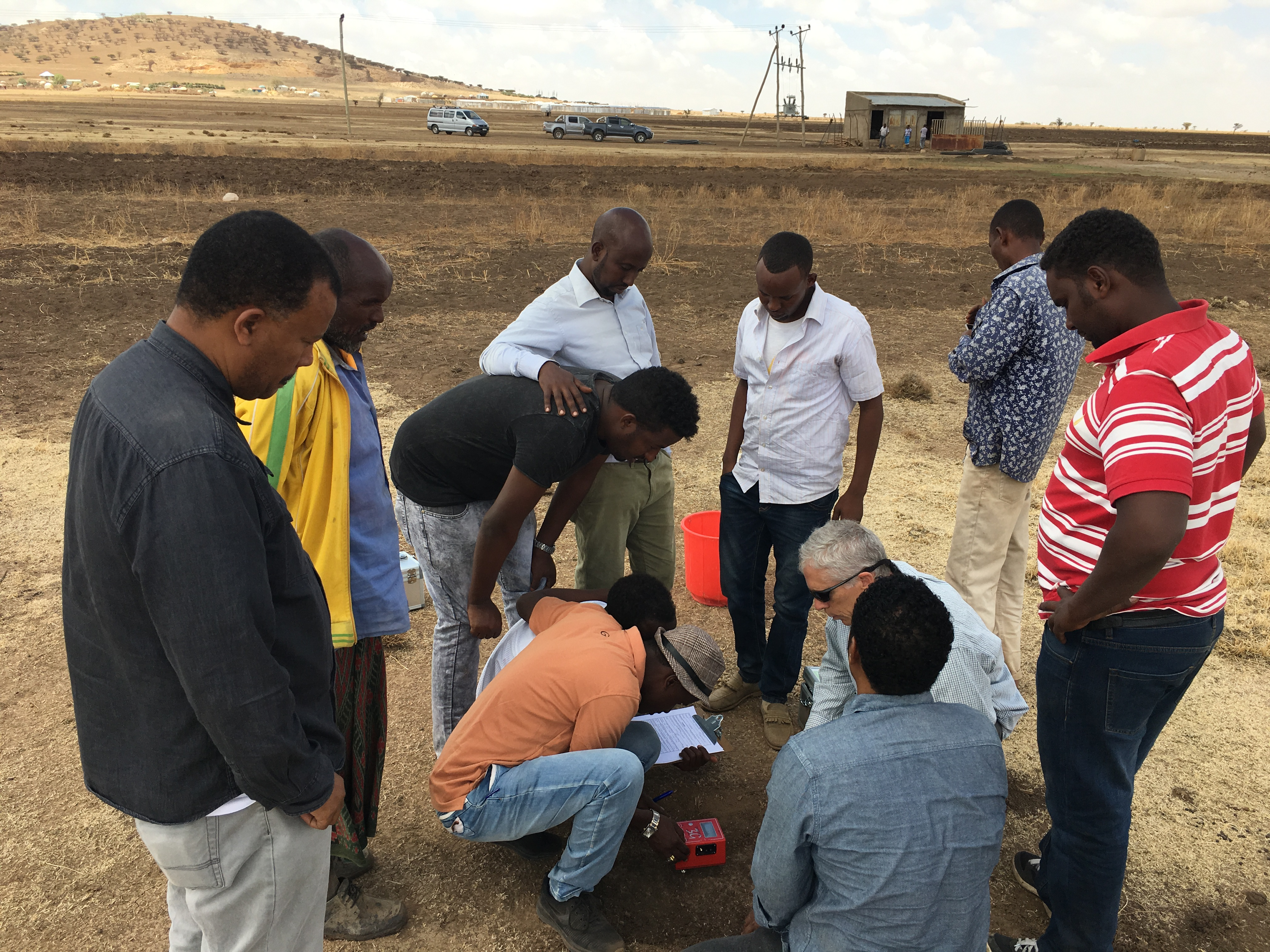 U.S. Geological Survey staff demonstrate the use of a Tromino, a passive seismic tool used for stratigraphy and bedrock mapping, to local water officials. Photo credit: USGS